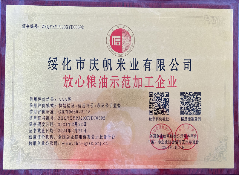關(guān)于慶帆米業(yè) 客戶至上 品質(zhì)優(yōu)良 您現(xiàn)在的位置:網(wǎng)站首頁 > 關(guān)于我們 > 資質(zhì)榮譽 企業(yè)文化 CORPORATE CULTURE 資質(zhì)榮譽 HONOR 領(lǐng)導(dǎo)致辭 LEADER’S SPEECH 公司簡介 COMPANY PROFILE 黑龍江省質(zhì)量品牌雙保障信用認(rèn)證企業(yè) 放心糧油示范加工企業(yè) 綠色品牌 中國綠色“健康米” 全國AAA級誠信企業(yè) 中國產(chǎn)品質(zhì)量檢測標(biāo)準(zhǔn)合格企業(yè) 共15條記錄 當(dāng)前為第2頁/共3頁上一頁123下一頁